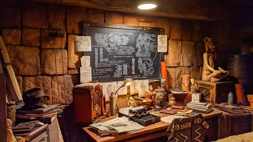 黒板上の図解は、通称「地図の間」に描かれたものです。クリスタルスカルを乗せる台座には、装飾が施された移動可能な物と、とぐろを巻いた蛇の柄のものがある様です。